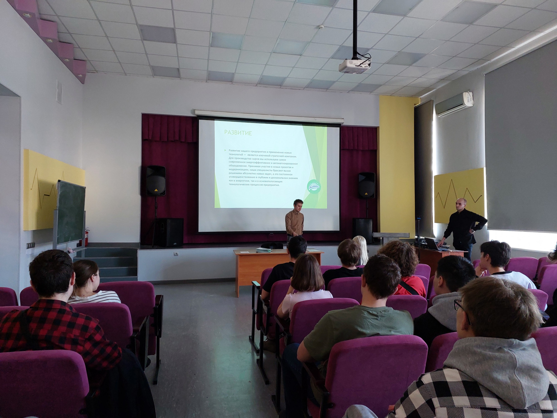 Преимущества трудоустройства на молкомбинате впечатлили аудиторию. Участие в спортивных мероприятиях района, возможность изучения иностранных языков, надбавки для молодых специалистов, а также работа на новом качественном оборудовании привлекли внимание студентов.